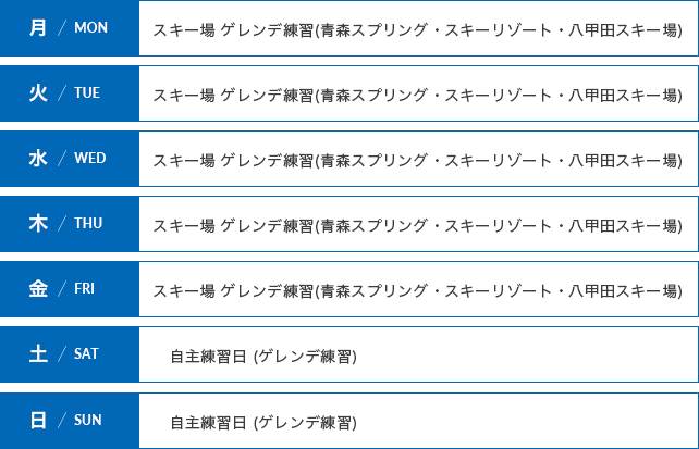 練習場所については最高の環境を追求し、スノーボード界で名門のゲレンデでもあり世界でもトップクラスのハーフパイプのコースを完備した「青森スプリング・スキーリゾート」で毎日練習できる環境が整っていますので、冬季シーズンは実践はもちろん、個人の目標に向かって本格的な練習ができます。春季期間(ゴールデンウイーク)も青森という土地柄、スノーボードが楽しめ、年間を通じてシーズンが長いので上達が早く、最高の環境といえます。日本で一番長い期間ゲレンデで練習ができ、楽しめるスノーボード部です。